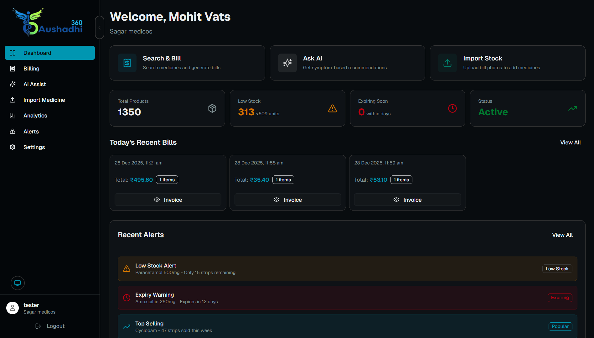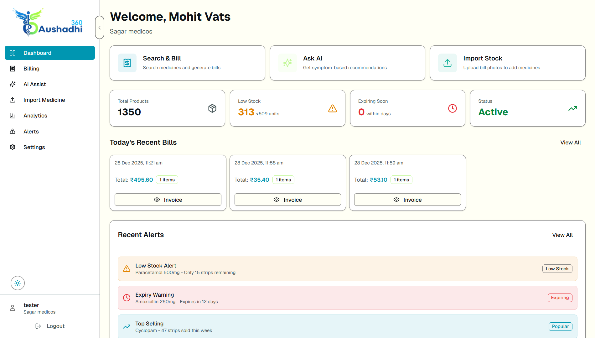 Try Aushadhi 360 instantly with the public demo credentials on the login page. AI features work with limited tokens in demo mode. For your own store, request access—once we verify your medical store details, we email your secure login.